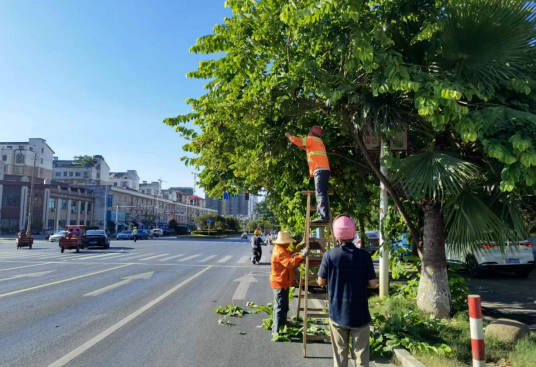 8月23日上午,几名园林工作人员冒着烈日高温修剪的“碍事”树枝,路过的公交车师傅无不感谢市政园林处及时清除
