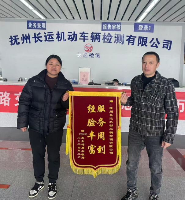 1月30日上午,车主冯勇和将一面写着“服务周到、经验丰富”的锦旗送到抚州长运机动车检测有限公司工作人员手