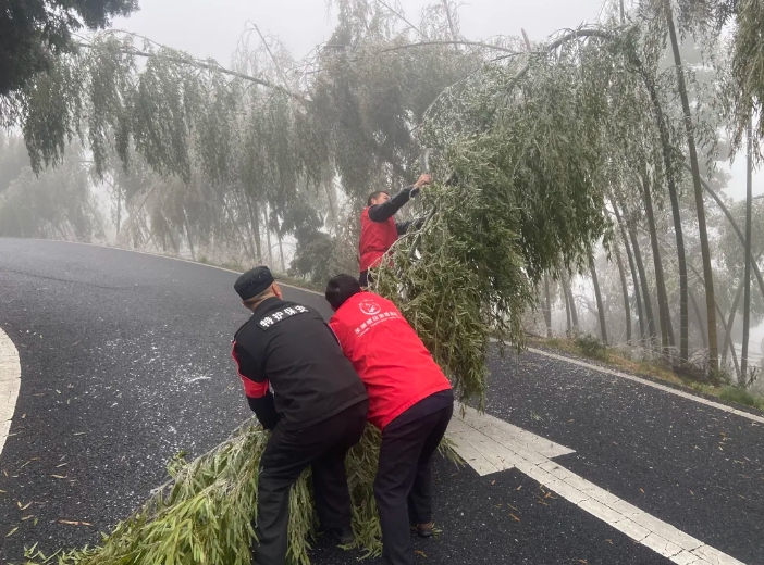 近日,受低温冰冻天气影响,武功山景区内部分竹子被冰冻后倒伏在路面上,给游客出行和景区车辆通行带来了安全隐
